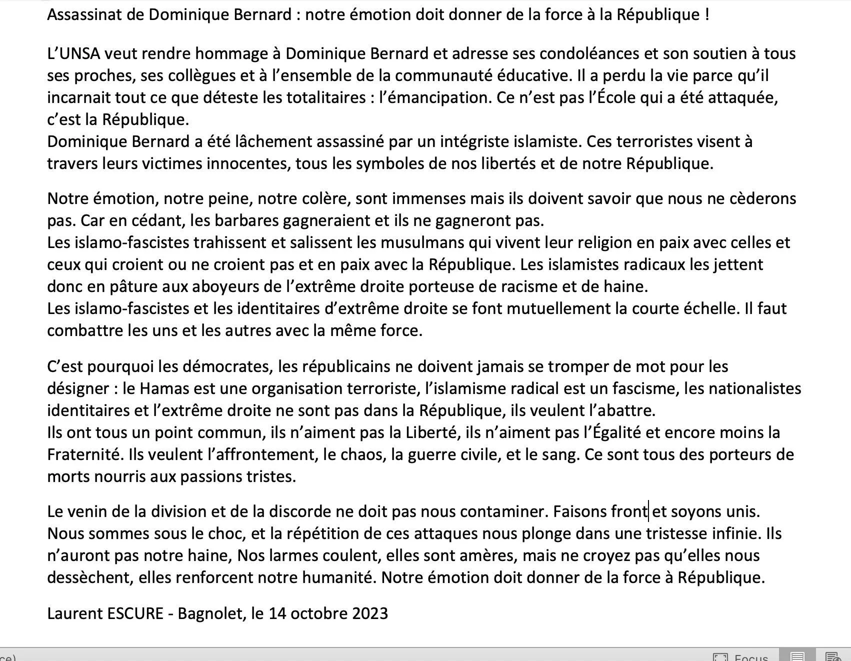 L’UNSA veut rendre hommage à Dominique Bernard et adresse ses condoléances et son soutien à tous ses proches, ses collègues et à l’ensemble de la communauté éducative.